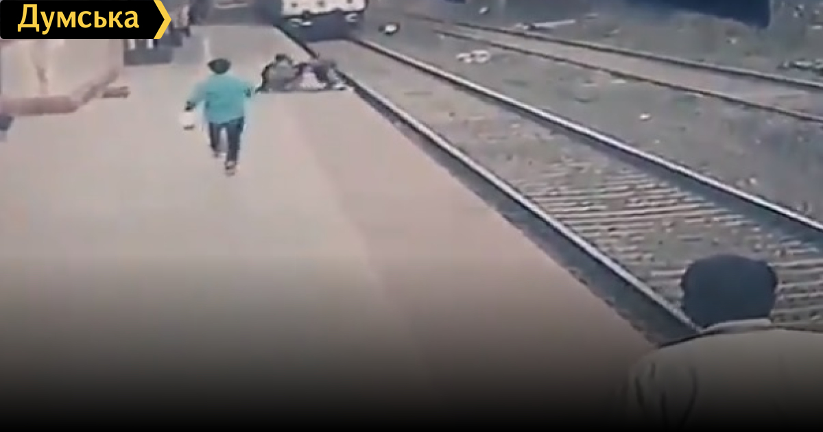 В Индии стрелочник чуть не попал под поезд, спасая упавшего на рельсы ребенка