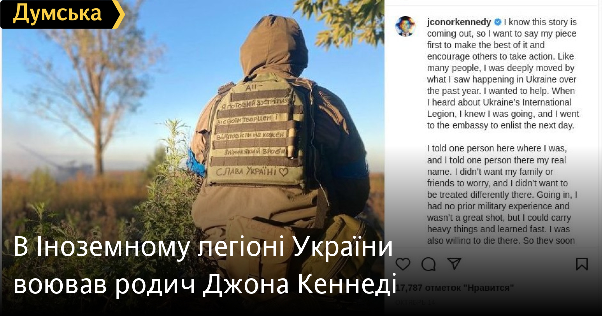 Доброволець української армії Конор Кеннеді розповів про свою службу. Внучатий племінник 35-го президента США Джона Кеннеді, онук сенатора Роберта Кеннеді, син відомого журналіста, екологічного юриста та активіста звернувся до українського посольства наступного дня після створення українського Іноземного легіону. Про це він повідомив у соцмережах. Як розповів Конор Кеннеді, він служив під чужим іменем, щоб не хвилювати друзів і родичів та не викликати до себе особливого ставлення. «У мене не було досвіду служби в армії, і я не був чудовим стрільцем, але я міг носити важкі речі і швидко вчився. Я також був готовий померти там», — написав Конор. За його словами, бійці Легіону — найхоробріші люди з усіх, кого він знає. На думку Конора, ця війна визначить долю демократії у XXI столітті. Він закликав вступати до лав Легіону і допомагати Україні в міру можливостей. СМЕРТЬ РОСІЙСЬКИМ ОКУПАНТАМ! Помітили помилку? Виділяйте слова з помилкою та натискайте control-enter |
