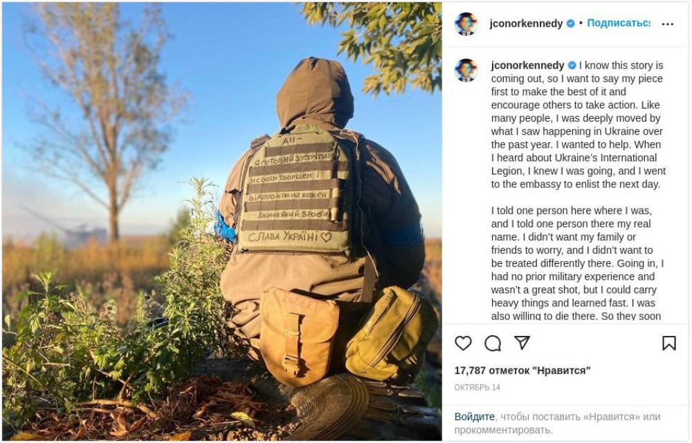 «У мене не було досвіду служби в армії, і я не був чудовим стрільцем, але я міг носити важкі речі і швидко вчився. Я також був готовий померти там», — написав Конор. За його словами, бійці Легіону — найхоробріші люди з усіх, кого він знає.
