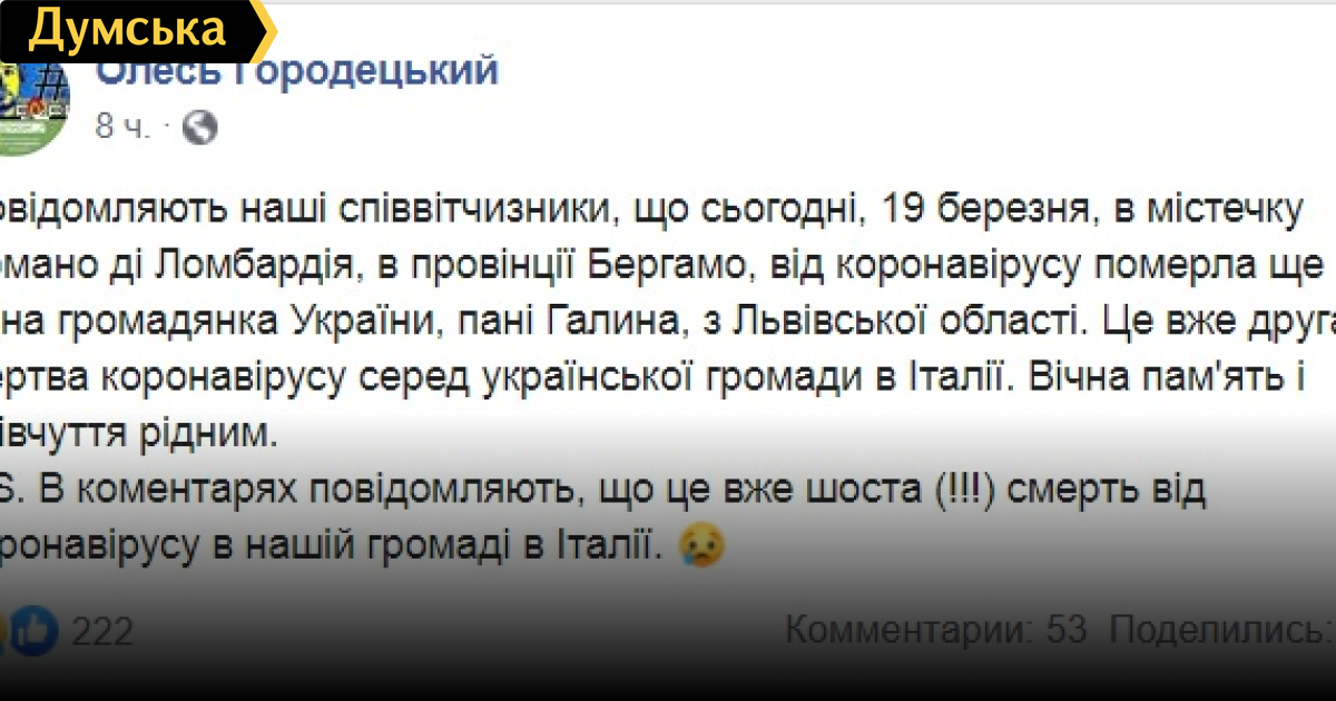 В итальянской провинции Бергамо от коронавирусной инфекции умерла украинка родом из Львовской области. Об этом сообщает председатель Христианского общества украинцев в Италии Олесь Городецкий. «Как сообщают наши соотечественники, 19 марта в городке Романо-ди-Ломбардия, в провинции Бергамо, от коронавируса умерла еще одна гражданка Украины — Галина из Львовской области. Это уже вторая жертва коронавируса в украинской общине в Италии», — сказал он. В комментариях под его постом в «Фейсбуке» сообщается, что это уже шестая смерть от коронавируса в Италии среди украинцев. В частности, как утверждает один из пользователей, в Италии умерли пять женщин и один мужчина из Украины. По информации МИД Украины, по состоянию на 23:30 19 марта лечение от коронавируса за границей проходят 13 украинцев, а на карантине находятся 38 граждан Украины. В частности, четверо граждан Украины лечатся в Германии; двое — в Италии, двое — в Польше; один — в ОАЭ и четверо — в Доминиканской Республике. По официальным данным, одна гражданка Украины за рубежом умерла от коронавируса — это произошло в Италии 13 марта. СМЕРТЬ РОСІЙСЬКИМ ОКУПАНТАМ! Помітили помилку? Виділяйте слова з помилкою та натискайте control-enter Новини по цій темі: 4 березня 2023: "Вакцини-довгожителі", або Як щеплення проти COVID-19 перетворилися в Україні на небезпечний ритуал 27 січня 2023: МОЗ зобов`язали опублікувати договори на закупівлю вакцин проти COVID-19: апеляційний суд задовольнив позов журналіста "Думської" 11 січня 2023: За тиждень в Одесі зафіксовано 159 випадків ковіду 4 січня 2023: За тиждень в Одесі зареєстровано 113 випадків ковіду |
