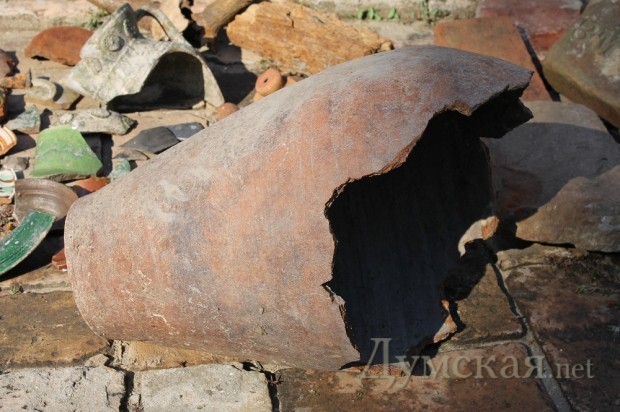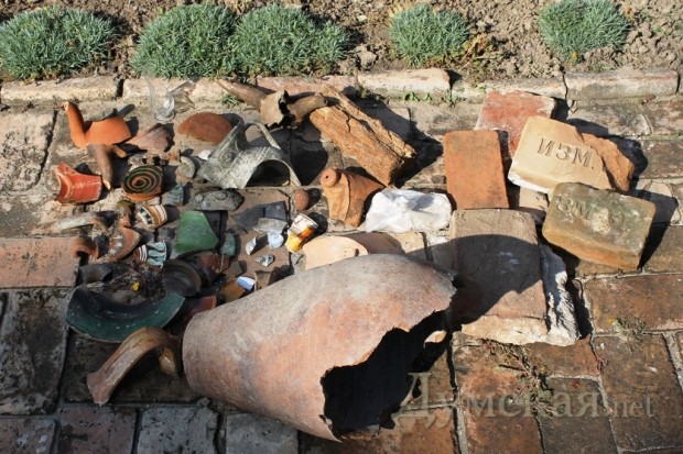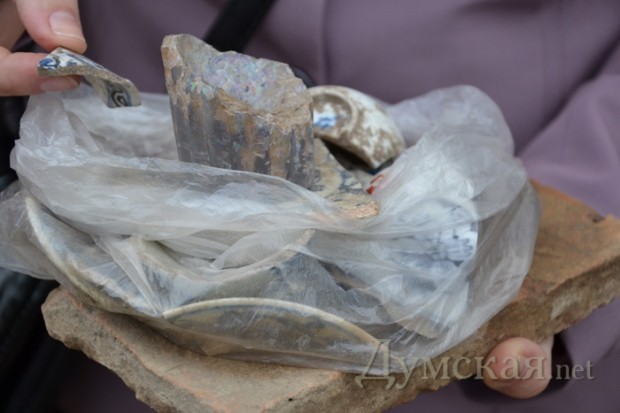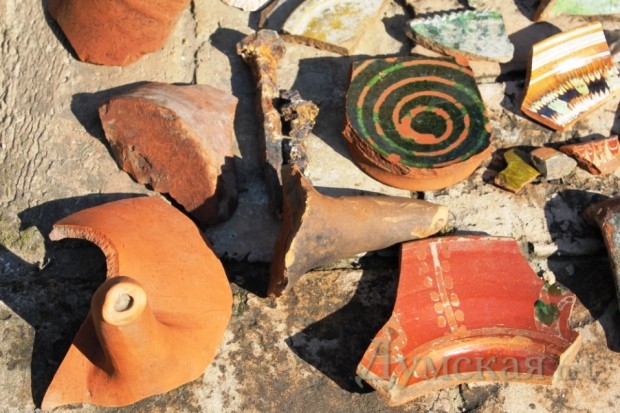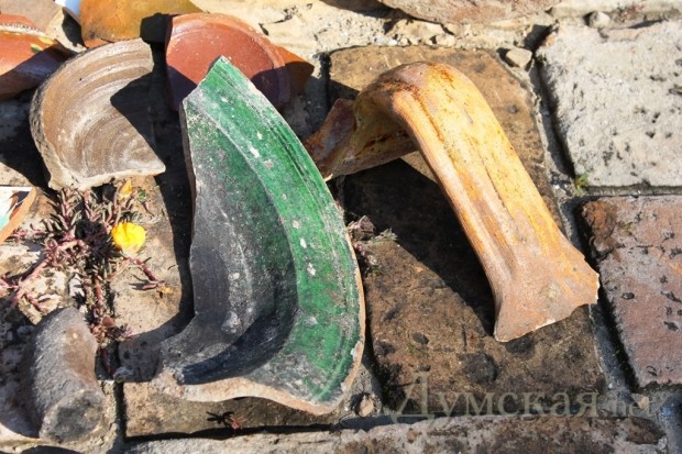 «Достаточно ровный вертикальный срез представляет стратиграфию участка, где на изрядной глубине четко прослеживается линия древней дневной поверхности, — отмечают историки. — Немногим выше следует линия другого слоя, в котором разворочены мощные каменные кладки на известковом растворе, профили мусорных ям, из которых вываливается керамика, кирпичная плинфа, осколки старинных стеклянных и железных изделий, кости животных и рыб, зола, камешки и пр. Все это вдавливается в землю строительной техникой. На расположенном к востоку участке, подвергнувшемуся «благоустройству», также были подобраны фрагменты турецкой поливной орнаментированной посуды, мисок, кувшинов, фаянсовых и фарфоровых расписных чашечек и обломок курительной трубки. Нам рассказали, что монастырский работник подобрал здесь прекрасную целую трубку с клеймом. Тут же находились несколько фрагментов человеческих костей, что, впрочем, неудивительно, так как вокруг Успенской церкви раньше было кладбище.