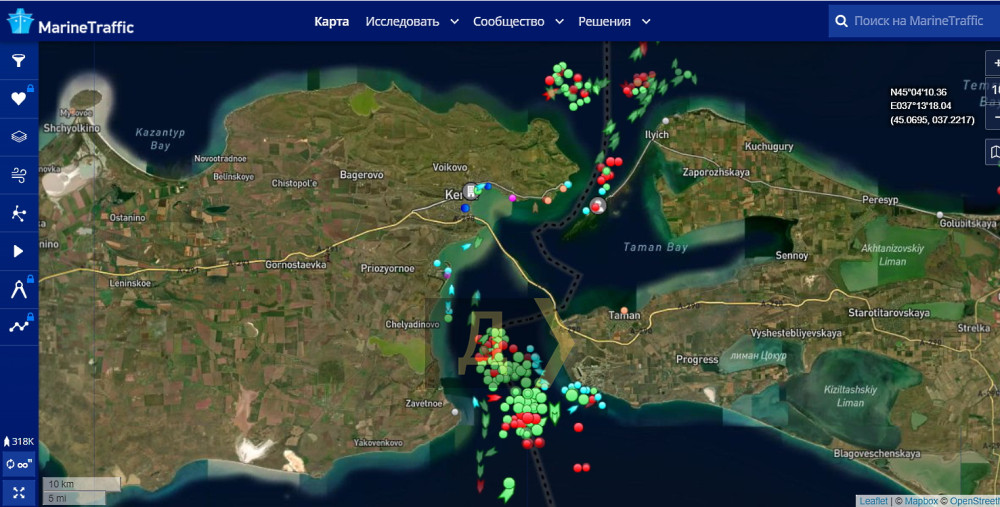 Судноплавство в районі Кримського мосту повністю паралізоване через ранковий вибух, усі суховантажі та танкери по обидва його боки перебувають у режимі очікування.