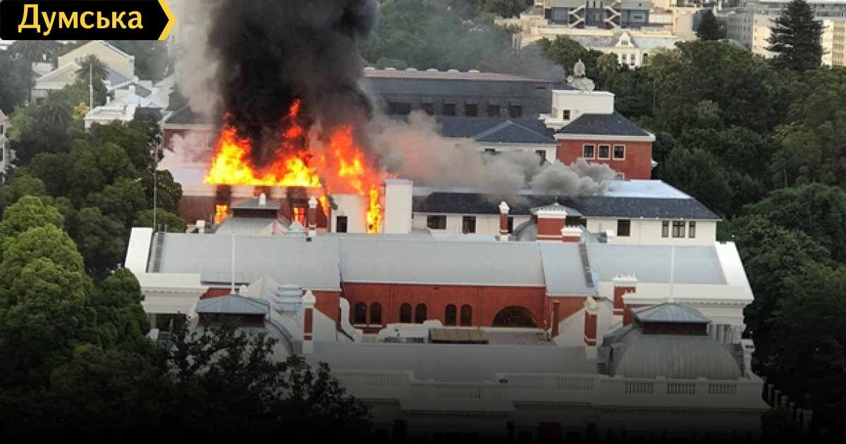 Сильный пожар вспыхнул в здании парламента ЮАР в городе Кейптаун. На видео с места события над зданием видны клубы густого дыма и открытый огонь. К тушению пожара привлечены более 50 спасателей. Огонь вспыхнул на третьем этаже, после чего распространился на офисные помещения и спортзал. Район вокруг здания парламента оцеплен. Представитель местной пожарной службы сообщил, что в результате пожара никто не пострадал. Что стало причиной пожара – пока неизвестно. СМЕРТЬ РОСІЙСЬКИМ ОКУПАНТАМ! Помітили помилку? Виділяйте слова з помилкою та натискайте control-enter Новини по цій темі: 11 грудня 2025: Нічна атака на Одещину: на енергооб'єктах спалахнули пожежі, пошкоджено будинки та адміністративну будівлю 20 жовтня 2025: В Одесі димить підстанція, а два райони міста частково залишилися без світла (відео) 9 жовтня 2025: Нічний удар по Одеській області: постраждали п'ятеро людей, понад 30 тисяч абонентів залишилися без світла 19 серпня 2025: У будівлі коледжу в центрі Одеси виявили труп невідомого |