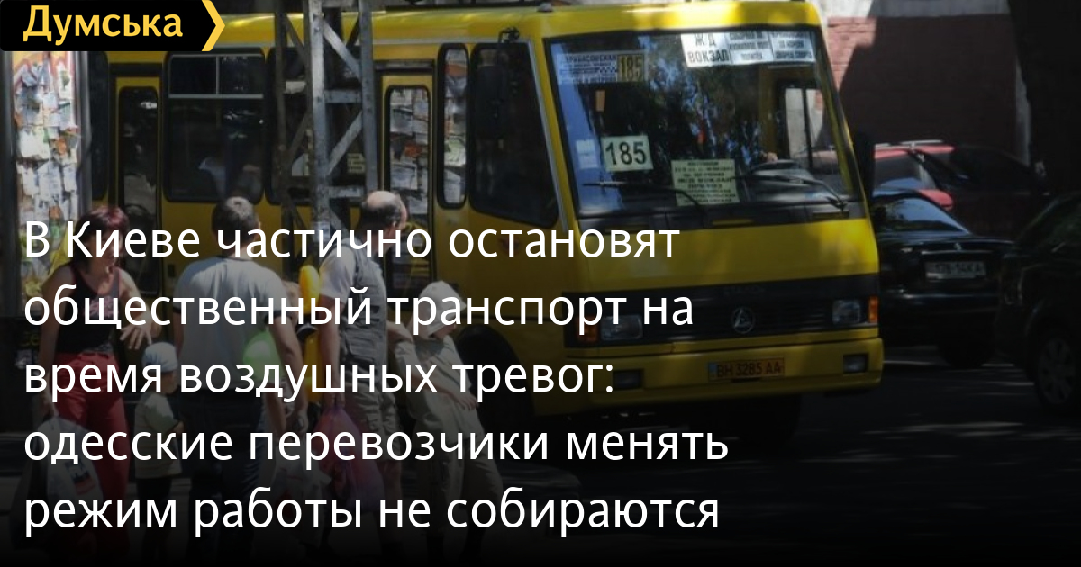 У Києві частково зупинять громадський транспорт під час повітряних тривог: одеські перевізники міняти режим роботи не збираютьсяВодії наземного громадського транспорту Києва, зокрема й приватні перевізники, під час повітряної тривоги зупинятимуть рух. Пасажири в цей час мають залишити салон та пройти до найближчого укриття, повідомляють у мерії Києва. Метро під час повітряної тривоги, як і раніше, не здійснюватиме перевезення наземними ділянками. Станції метро, розташовані на поверхні, будуть закриті. Таке рішення Ради оборони міста Києва діятиме з 1 серпня. Одеські перевізники не планують змінювати режим роботи, повідомили у міському департаменті транспорту. Причому це стосується як міськелектротрансу, так і маршруток.