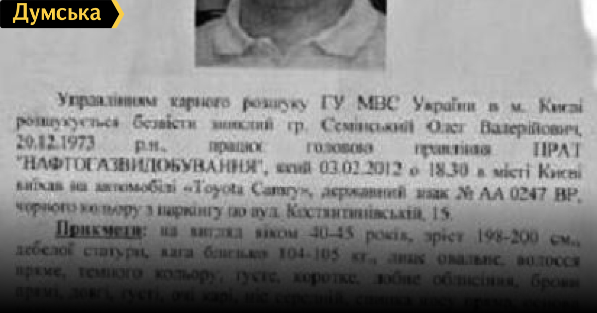 Объявления о пропаже Семинского висят на каждой станции киевского метро: 38-летний Олег Семинский был одет в модельную норковую шапку и кожаную куртку с воротником из норки фирмы Zilli. Кроме того, на бизнесмене были ботинки 46-го размера темного цвета фирмы Gucci.