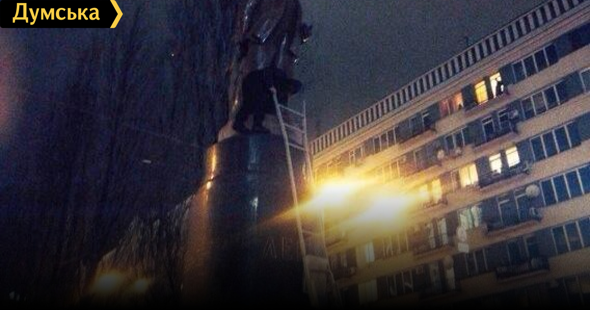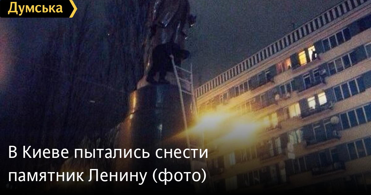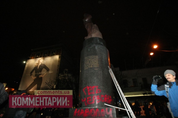 Как сообщает «Громадське ТВ», около сотни человек в масках окружили памятник, обмотали его тросами и пытались снести. После прибытия на место событий сотрудников «Беркута» на площади произошла потасовка, в ход пошли дымовые шашки.
