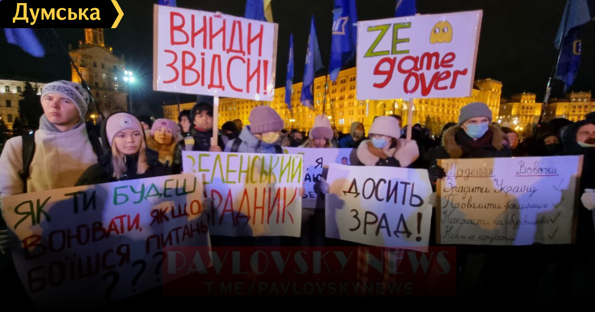 Вечером 1 декабря в центре Киева прошла многотысячная акция «Защити Украину — останови переворот», в которой приняли участие представители различных политических сил, общественных организаций и обычные граждане. Люди прошли маршем от Майдана Независимости до улицы Банковой, к Офису президента, а оттуда вышли на улицу Лютеранскую и отправились под здание Верховной Рады. Участники акции вели себя мирно, скандировали «Зелю геть». Выступающие со сцены призывали украинцев к объединению, требовали досрочных выборов в Раду, отставки президента Зеленского и главы ОП Андрея Ермака. Митингующих все время окружало большое количество правоохранителей, но никаких стычек с полицией не произошло. Напомним, на минувшей неделе в ходе пресс-марафона Зеленский заявил, что на 1 декабря в стране планировался государственный переворот. СМЕРТЬ РОСІЙСЬКИМ ОКУПАНТАМ! Помітили помилку? Виділяйте слова з помилкою та натискайте control-enter |