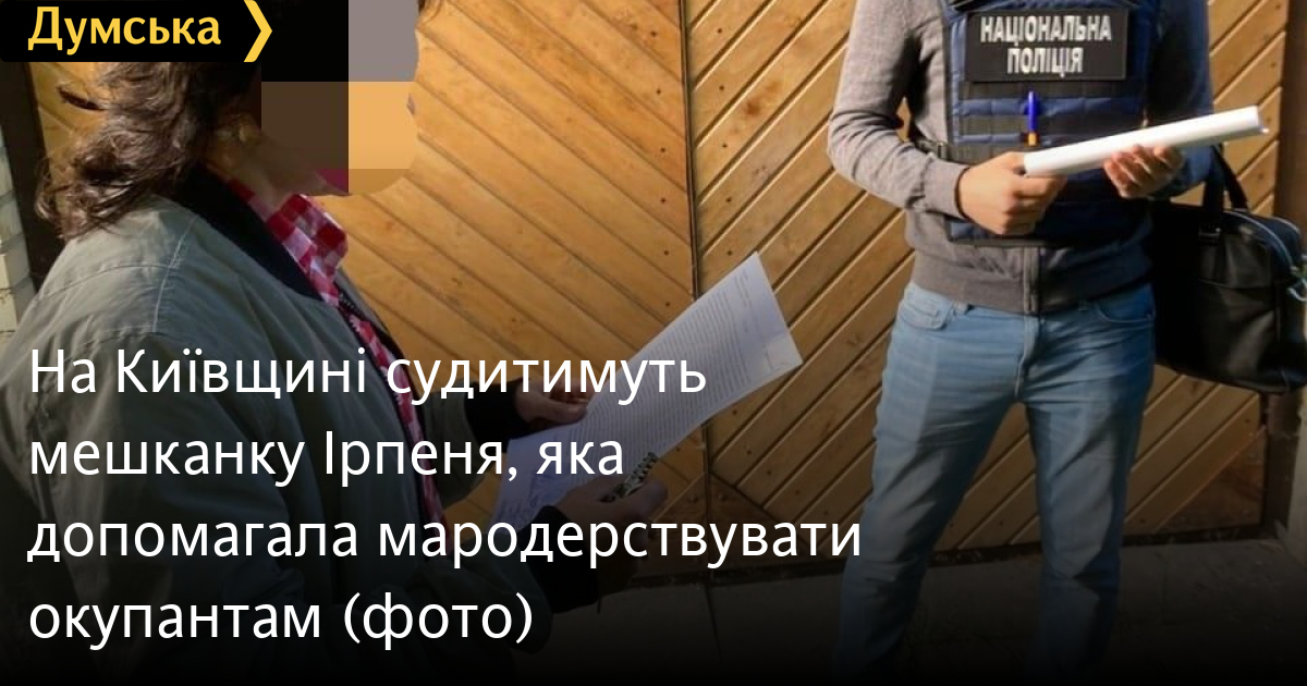 Головне слідче управління Нацполіції направило до суду обвинувальний акт щодо 45-річної мешканки Ірпеня, яка допомагала окупантам грабувати будинки забезпечених мешканців міста.