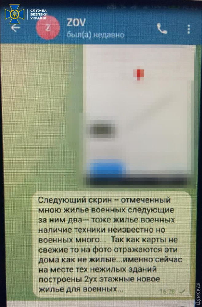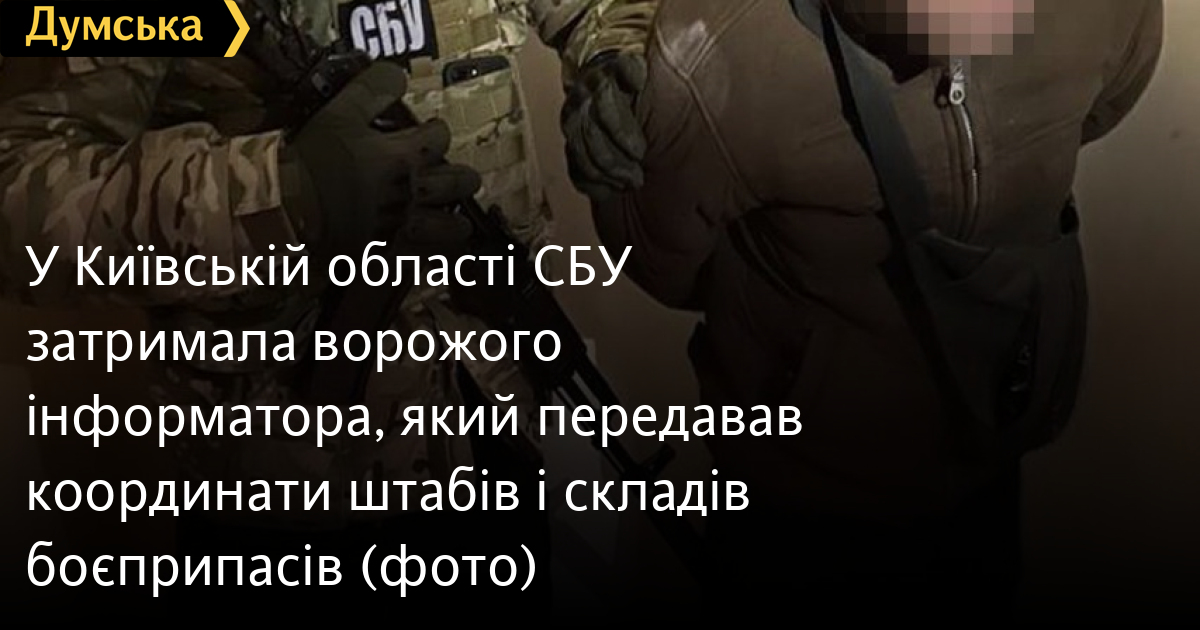Оперативники Служби безпеки України викрили та затримали мешканця Білої Церкви, який передавав ворогу інформацію про пересування підрозділів Сил оборони, вишукував штаби управління військами та склади з артилерійськими боєприпасами, об'єкти енергетичної інфраструктури.