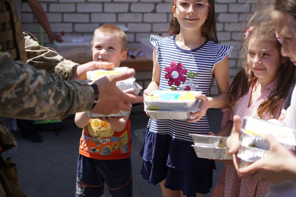 Военные со своей стороны тоже подготовили сюрприз – лично приехали забрать у маленьких украинцев угощения и повидаться с ними. Дети с улыбками отдавали коробочки с едой и благодарили за защиту.