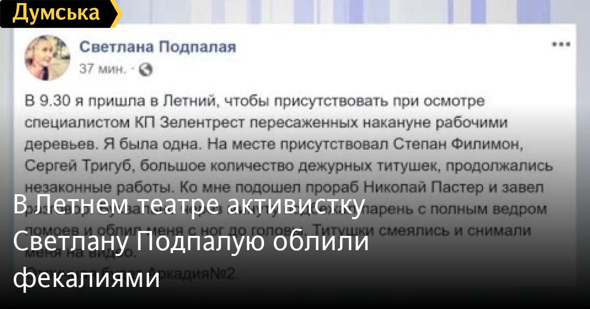 Активистку Светлану Подпалую облили фекалиями в Летнем театре. Полиция начала расследование по статье «хулиганство». Это уже второе нападение – в апреле здесь облили нечистотами народного депутата Мустафу найема.