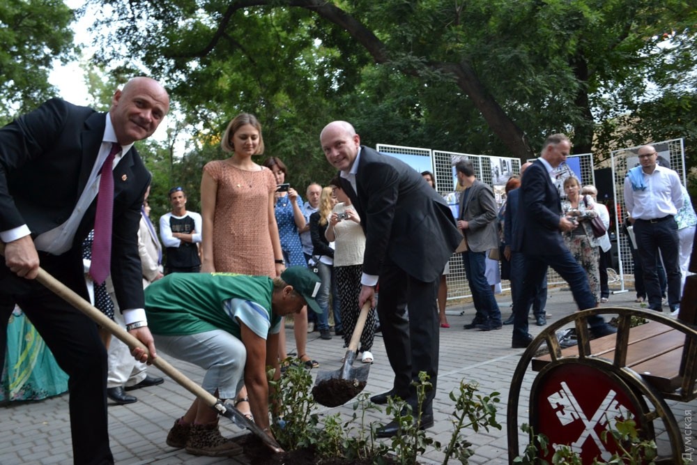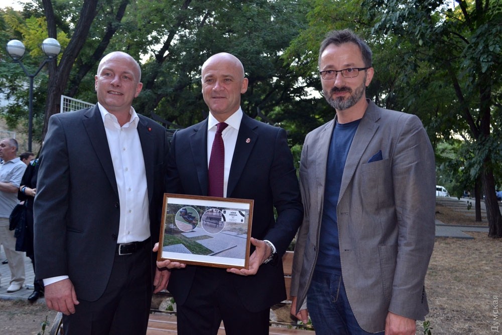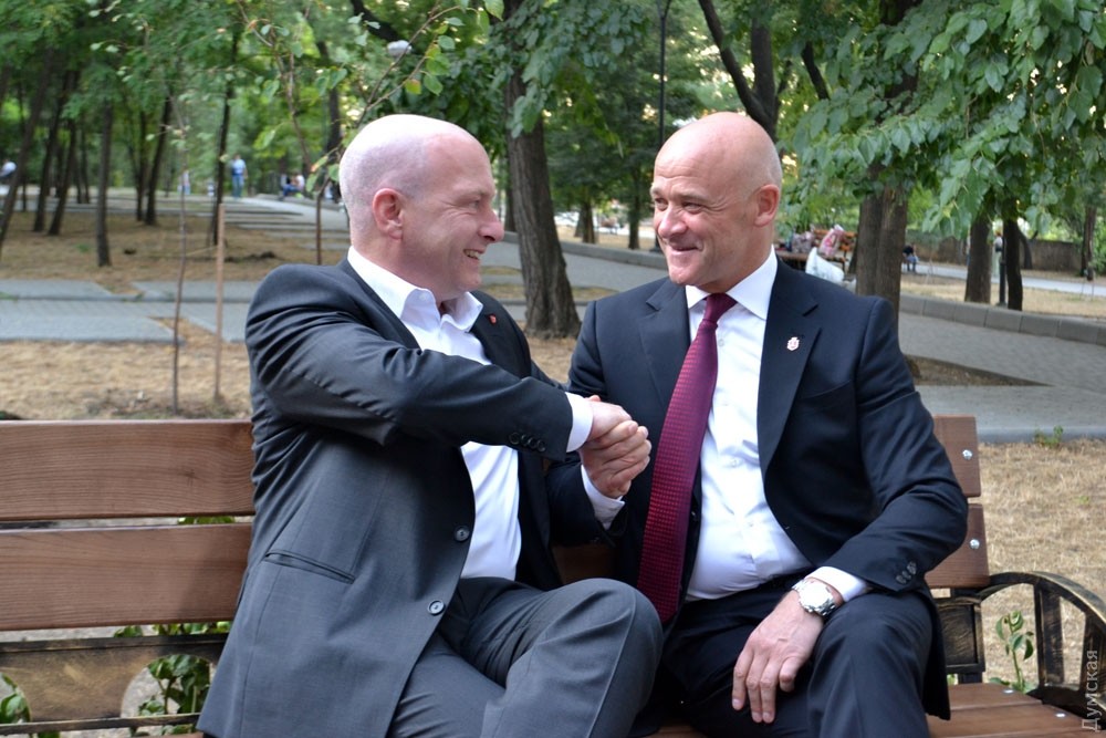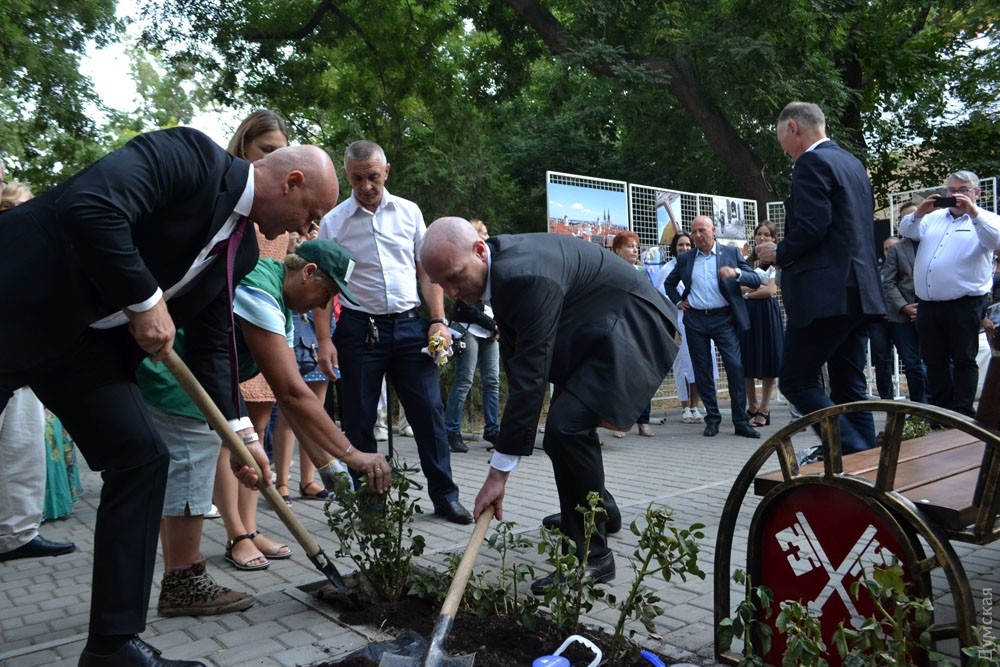 Сегодня в рамках празднования 222-летней годовщины основания Одессы, мэр города Геннадий Труханов и мэр Регенсбурга Йоахим Вольбергс открыли скамейку с символом города-побратима Регенсбурга. В ходе открытия новой достопримечательности мэры посадили по кусту роз и пошутили о своей внешней схожести — оба градоначальника одного типа телосложения без растительности на голове и в похожих костюмах. Мэр Регенсбурга Йоахим Вольбергс даже в шутку предложил Геннадию Труханову поменяться местами. Кроме того вице-мэр польского города-побратима Лодзь Кшиштоф Пентковский предложил Труханову на следующий год установить скамейку с символом своего города и подарил фото скамейки, которую они планируют установить в Одессе. Фото Андрей Колисниченко СМЕРТЬ РОСІЙСЬКИМ ОКУПАНТАМ! ![]() Вице-мэр польского города-побратима Лодзь Кшиштоф Пентковский подарил мэру Одессы фото скамейки с символом своего города Помітили помилку? Виділяйте слова з помилкою та натискайте control-enter |