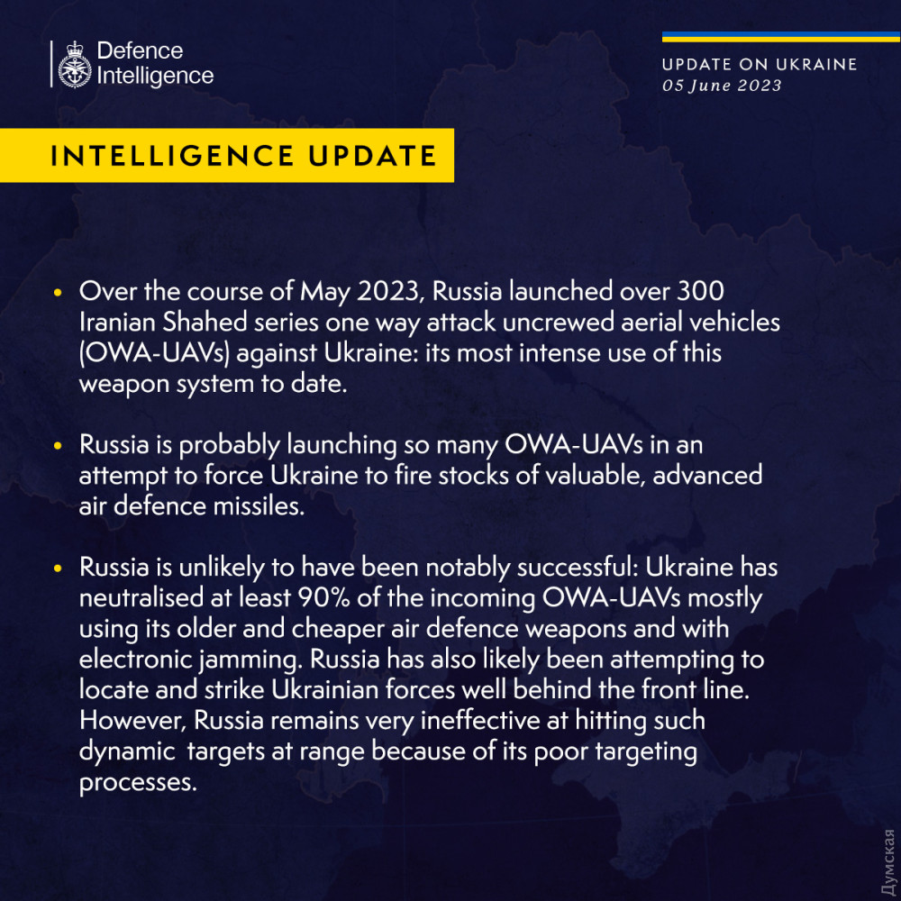 Англійські аналітики вважають, що завдяки дронам-камікадзе ворог намагається досягти двох цілей: виснажити українські запаси ракет для західних систем ППО і, в разі успішного польоту дронів, — завдавати ударів по військових об'єктах.