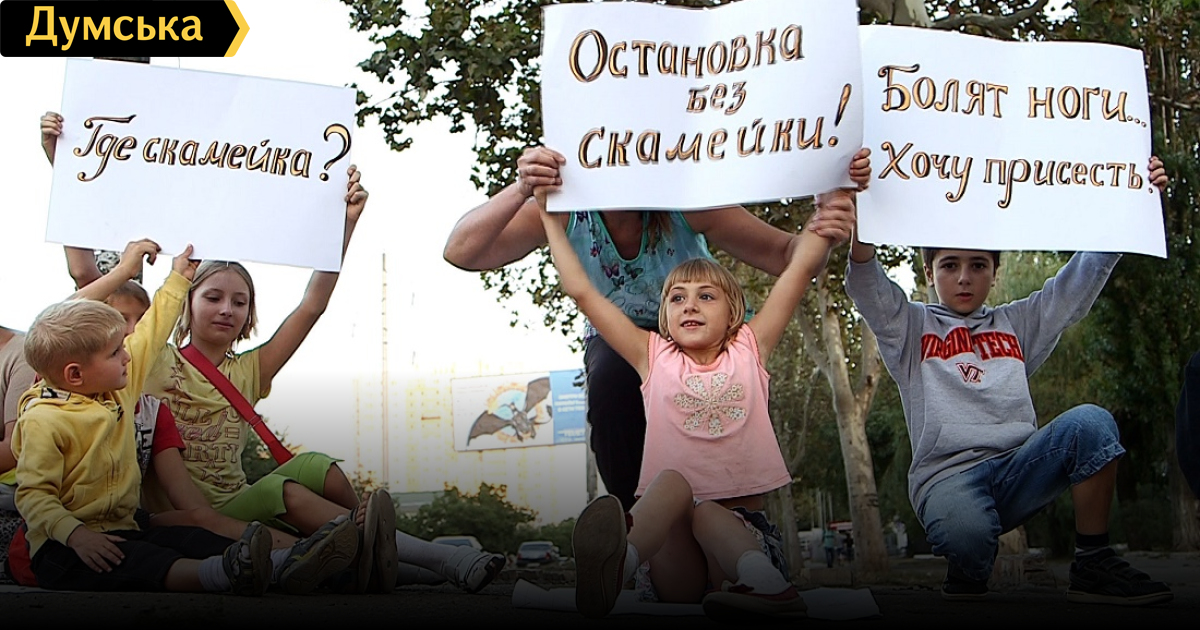 На пересечении улиц Малиновского и Гайдара прошла необычная акция протеста — дети и их родители сидели прямо на асфальте. Таким способом они хотели привлечь внимание чиновников к проблеме отсутствия на улицах скамеек, из-за чего особенно страдают пожилые люди.