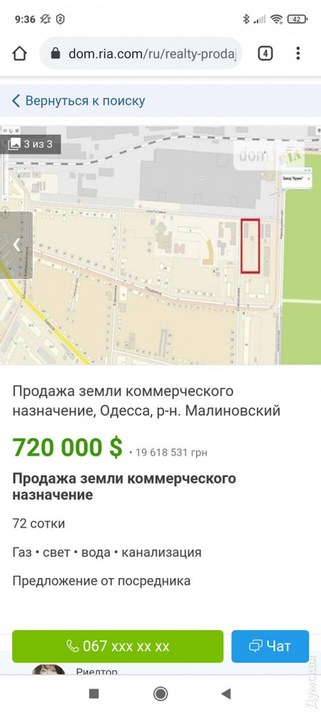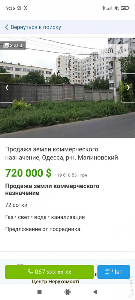 Цена за землю указана в 720 тысяч долларов, продавец сообщает, что на участке есть доступ к коммуникациям газоснабжения, электричества, водопровода и канализации.