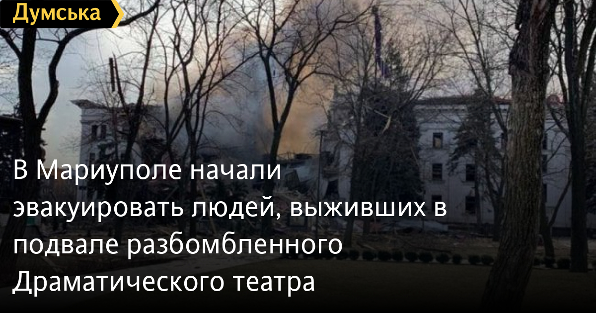 В Мариуполе начали эвакуировать людей, выживших в подвале разбомбленного Драматического театраПервые 150 человек спасены из подвала Драматического театра в Мариуполе, который российские нацисты уничтожили сверхмощной бомбой 16 марта. Об этом сообщила омбудсмен Людмила Денисова в эфире «24 Канала». По ее словам, в подвале находятся еще более 1300 мариупольцев. «Мы молимся, что все будут живые, но никакой информации про них нет», – сказала Денисова. СМЕРТЬ РОССИЙСКИМ ОККУПАНТАМ! Заметили ошибку? Выделяйте слова с ошибкой и нажимайте control-enter |