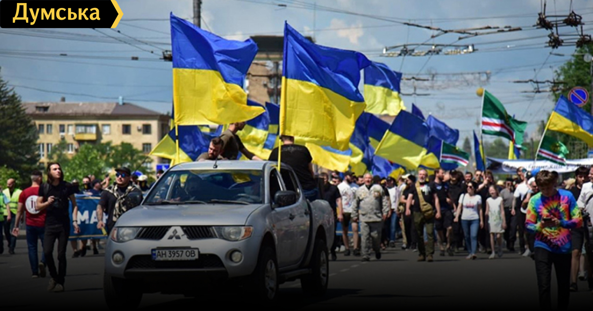 Центральным проспектом до Театральной площади двинулась колонна военной техники и пешая колонна представителей силовых структур: работники Нацполиции Украины, военнослужащие полка «Азов» и других подразделений, спасатели и курсанты ДонДУВД МВД Украины.