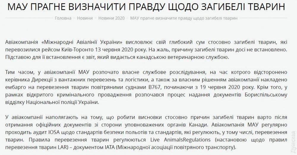 В авиакомпании «Международные Авиалинии Украины» выразили соболезнования относительно гибели животных, которых перевозили рейсом Киев-Торонто 13 июня 2020.