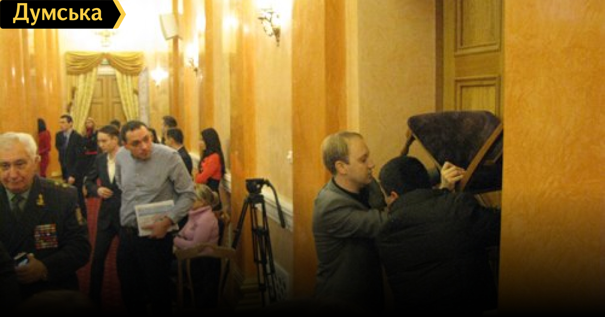 Двери сессионного зала заблокированы изнутри стулом. Присутствующий на сессии нардеп Игорь Марков призвал коллег-спортсменов выйти к радикалам и дать им достойный отпор. Фото сайта «Одессит»