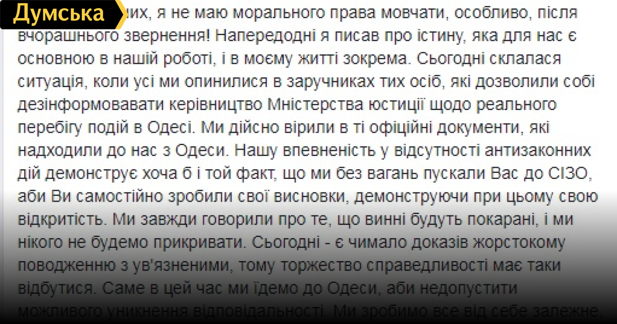 В Министерстве юстиции Украины говорят, что руководство ведомства дезинформировали по поводу ситуации в следственном изоляторе Одессы. Такое заявление сделал пресс-секретарь замминистра Юрий Маслак. Ранее, напомним, он отрицал, что в СИЗО после убийства сотрудницы избивают заключенных. «Сегодня сложилась ситуация, когда мы все стали заложниками у тех, кто дезинформировал руководство Министерства юстиции Украины о реальном положении дел в Одессе, — признает Маслак. — Мы действительно верили в те официальные документы, которые поступали к нам из Одессы, и нашу уверенность в том, что там не происходит ничего противозаконного подтверждает хотя бы то, что мы беспрепятственно допускали вас в СИЗО. Сегодня есть немало доказательств жестокого обращения с заключенными в СИЗО и мы едем в Одессу, чтобы не допустить избежания ответственности всеми виновными». СМЕРТЬ РОСІЙСЬКИМ ОКУПАНТАМ! Помітили помилку? Виділяйте слова з помилкою та натискайте control-enter Новини по цій темі: 13 липня 2024: В одеському СІЗО за 5 млн грн полагодять дах "блатного" корпусу з камерами для VIP-арештантів 13 липня 2024: В Одеській області арештантові намагалися передати наркотики за допомогою кухонної губки 5 лютого 2024: Вимагали гроші на волі та продавали наркотики у в`язниці: в Одесі накрили банду під керівництвом «злодія в законі» (фото) 18 грудня 2023: Ціни в доларах, знижки військовим і поліцейський шмаровоз у комендантську годину: як велика війна вплинула на одеську проституцію 18 листопада 2023: В Одесі арештантові поштою надіслали печиво з наркотичною пудрою |