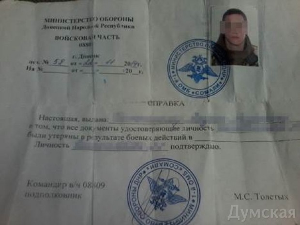 Во время обыска у задержанного изъяли паспорт гражданина Украины и документы, подтверждающие его участие в боевых действиях на стороне «ДНР» — «Удостоверение личности старшего лейтенанта», справка «министерства обороны «ДНР», а также «увольнительная записка». Также «Академик» имел при себе несколько комплектов военной формы с шевронами первой батальонно-тактической группы «Сомали» и группы «Гиви», шевроны ВС РФ.