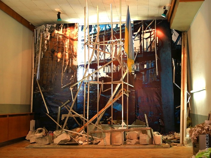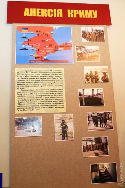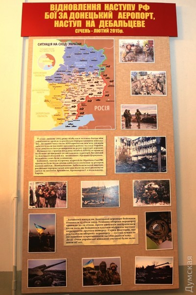 Стены зала украшают большие стенды, на которых запечатлена вся история войны с Россией — аннексия Крыма, столкновения на границе, бои за Саур-Могилу, Славянск, Краматорск, за Донецкий аэропорт и наступление на Дебальцево.