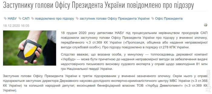 В НАБУ официально заявили о подозрении замглавы Офиса президента — Татаров может быть причастен к махинациям с квартирами НацгвардииНациональное антикоррупционное бюро Украины объявило подозрение в причастности к коррупции заместителю главы Офиса президента Олегу Татарову, подтвердив ранние сообщения о готовящемся подозрении. Об этом говорится в сообщении на сайте НАБУ. По данным следствия, Татаров, который в прошлом был топ-менеджером государственной компании «УкрБуд», может быть причастным к коррупционной схеме по делу о завладении 81 млн гривен Национальной гвардии Украины. В НАБУ уточняют, что подозреваемыми в этом деле проходят три человека — кроме Татарова по делу подозреваются заместитель директора Государственного научно-исследовательского экспертно-криминалистического центра МВД Украины (ч.3 ст.368 УК Украины) и бывший народный депутат и бывший конечный бенефициарный владелец ООО «Укрбуд Девелопмент» (ч.3 ст.369 УК Украины) Максим Микитась. Ранее сообщалось, что Микитася выпустили из СИЗО после того, как он возместил 50 млн гривен ущерба. Отметим, расследовании аферы с квартирами завершили в мае 2020 года. По данным следствия, застройщик в сговоре с командующим Национальной гвардии вместо квартир в построенном на Печерске жилом комплексе предоставил военнослужащим жилье на левобережной части Киева. Ущерб государству составил более 80 млн гривен. СМЕРТЬ РОСІЙСЬКИМ ОКУПАНТАМ! Помітили помилку? Виділяйте слова з помилкою та натискайте control-enter |
