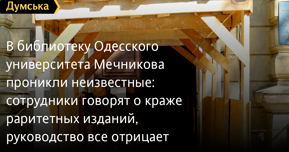 Фонды научной библиотеки Одесского национального университета имени Мечникова — одной из старейших в Украине — стали объектом противоправного посягательства. Возможно, речь идет о преступлении десятилетия, которое переплюнет по последствиям кражу картины Микеланджело Меризи да Караваджо «Поцелуй Иуды» из музея западного и восточного искусства.