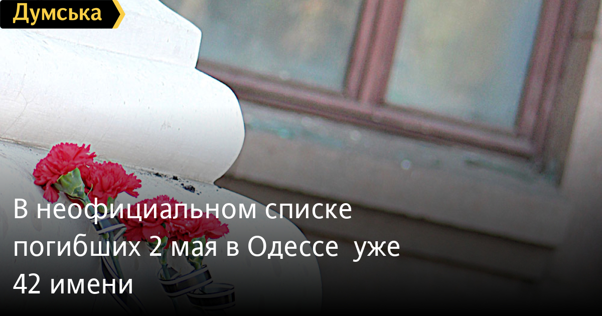 Списки, напомним, одесситы составляют самостоятельно на форумах и в соцсетях. Милиция имена и причины смерти до сих пор не подтверждает, ссылаясь на тайну следствия, однако заявляет, что личности большинства погибших действительно установлены, нескольких придется опознавать с помощью анализа ДНК. В столкновениях 2 мая погибли 46 человек. В неофициальном списке сейчас – 42 имени.