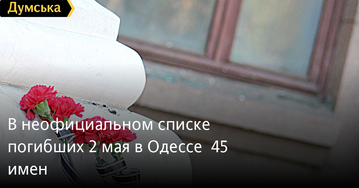 Этот список, напомним, одесситы составляют самостоятельно. Сейчас в нем - 45 имен. Всего в результате событий 2 мая погибли 48 человек. Имена погибших госструктуры по-прежнему не подтверждают.
