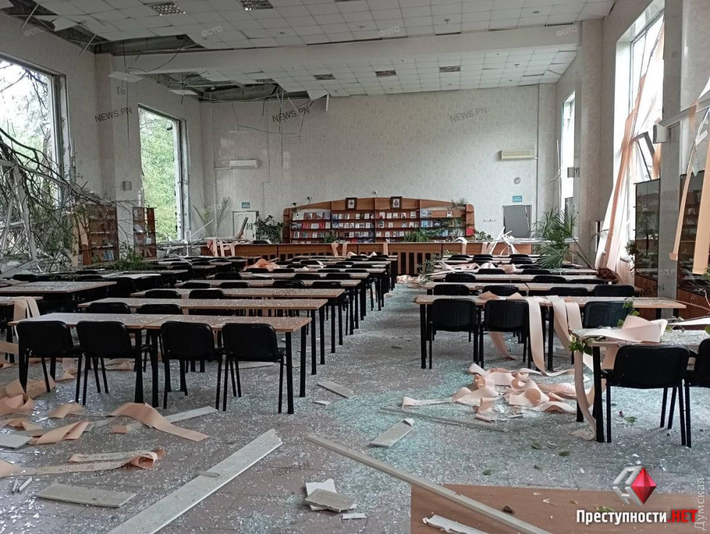 Ракети частково зруйнували фасад будівлі, вибуховою хвилею вибило вікна, зруйнувало перекриття усередині.