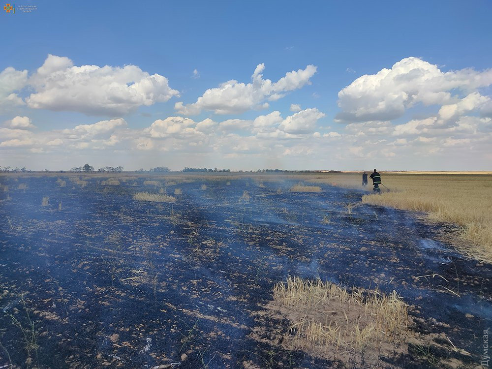 Через попадання ворожих боєприпасів та їхніх уламків згоріли близько 233 гектарів врожаю пшениці поблизу сіл Котлярево та Лимани, повідомляють миколаївські рятувальники.