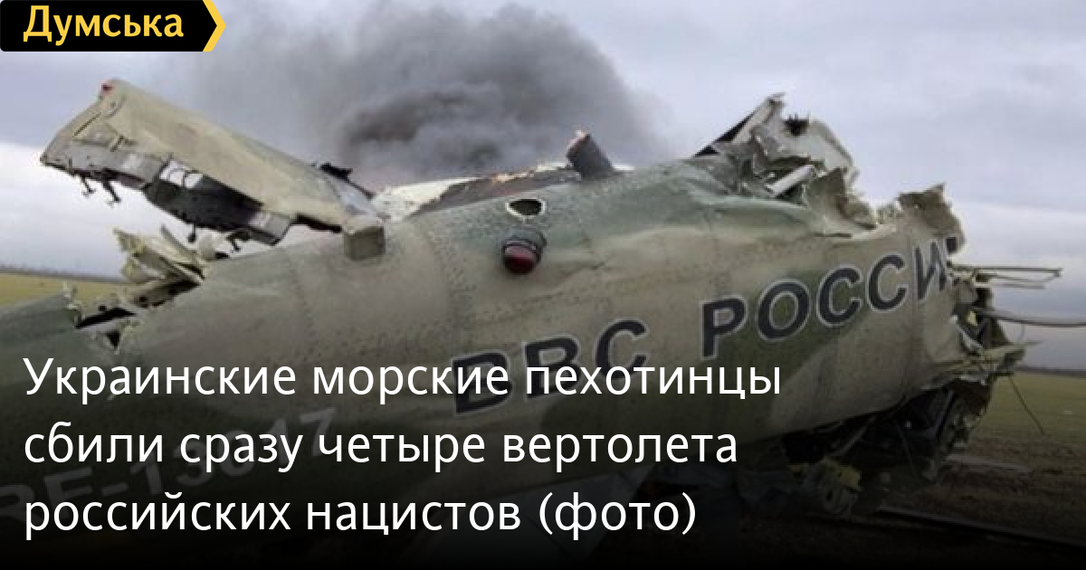 Сразу четыре вертолета российских нацистов сбили сегодня в Николаевской области морские пехотинцы ВМС Украины вместе с военнослужащими одного из подразделений Сухопутных войск.