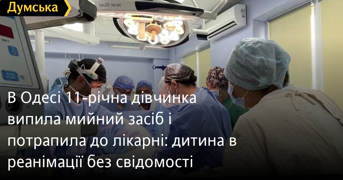 В Одесі 11-річна дівчинка випила мийний засіб і потрапила до лікарні: дитина в реанімації без свідомостіОдинадцятирічна дівчинка переплутала пляшки і випила засіб для плити «Антижир». Наразі дитина непритомна в реанімації дитячої обласної лікарні, повідомили «Думській» власні джерела. Пацієнтці діагностували хімічний опік ротової порожнини, стравоходу і шлунка. СМЕРТЬ РОСІЙСЬКИМ ОКУПАНТАМ! Помітили помилку? Виділяйте слова з помилкою та натискайте control-enter Новини по цій темі: 29 липня 2025: В Усатово Одеської області сталася перестрілка: поліція працює на місці (відео, оновлено) 28 липня 2025: П'яний на "Ягуарі" або гіпертонік? Звільнений топ-посадовець одеської поліції хоче повернутися на службу 19 червня 2025: Дівчинку, яку шукали сотні одеситів, знайшли вбитою: поліція працює з чоловіком, ймовірно причетним до загибелі 27 травня 2025: Увели гектар в університету: на Одещині засудили земельних аферистів, але без посадки і Хвоста |
