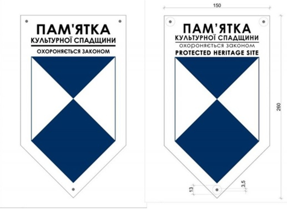 Об'єкти, що знаходяться під захистом конвенції, мають відмітний знак — загострений знизу щит, розділений на чотири частини синього та білого кольорів.