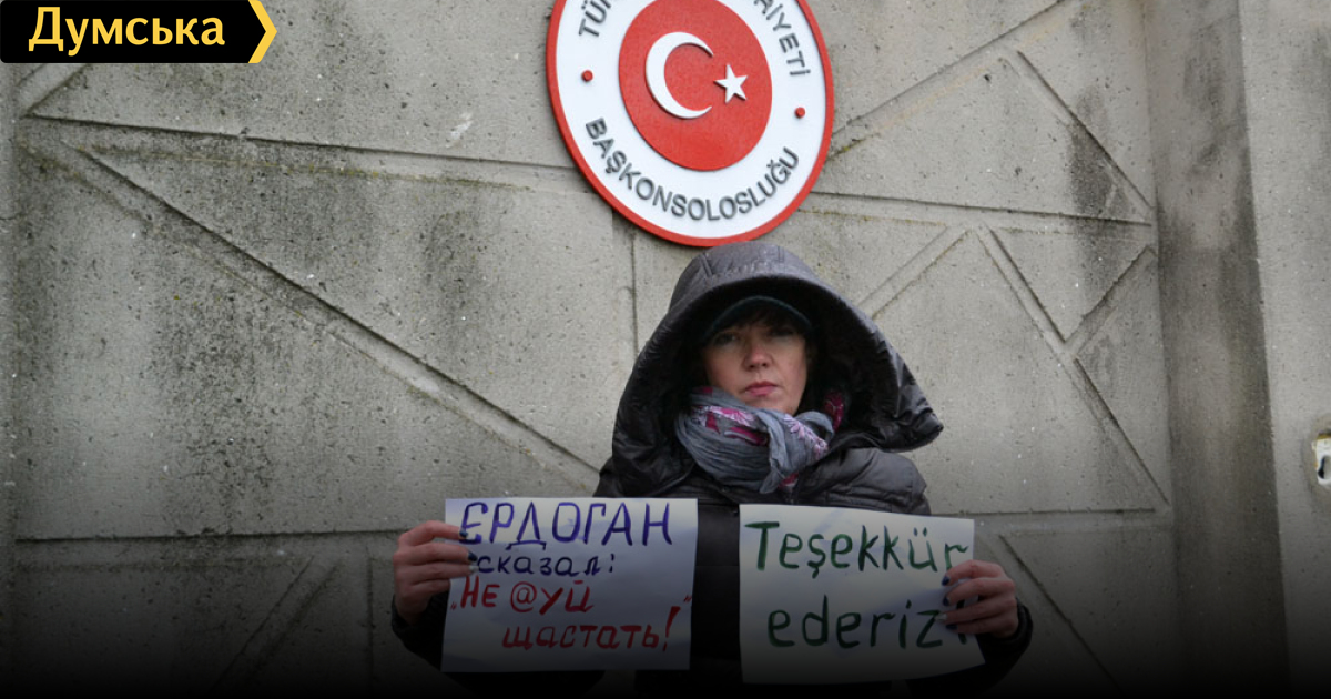 Как передает корреспондент «Думской», в руках она держала плакаты «Турция, мочи российского агрессора» и «Эрдоган сказал, нех@й шастать».