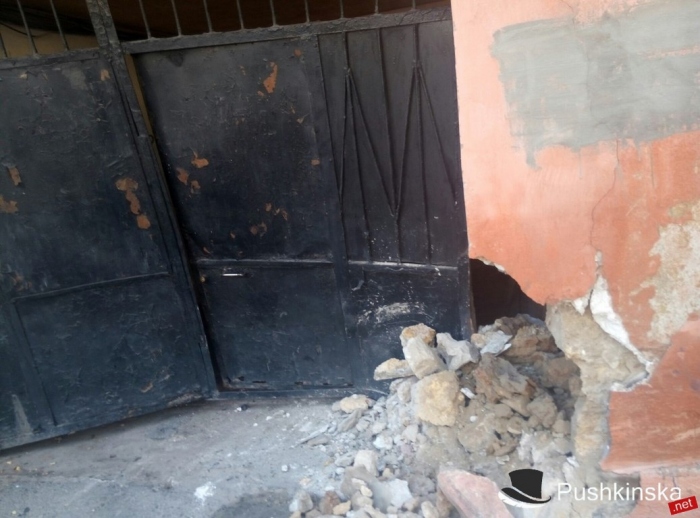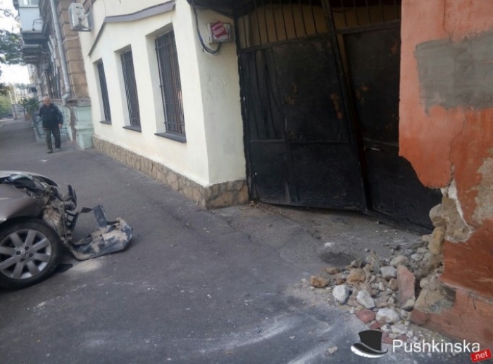 В результате удара от стены отвалился фрагмент. По словам очевидцев, водитель авто был пьян и скрылся с места происшествия, оставив машину.
