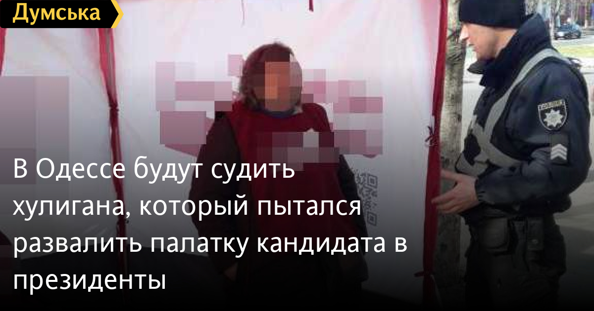 В Одессе будут судить хулигана, который пытался развалить палатку кандидата в президентыВ Одессе полиция задержала мужчину, который хулиганил возле палатки кандидата в президенты. Как сообщила пресс-служба ГУНП, инцидент произошел на улице Академика Вильямса. Нетрезвый мужчина, проходя мимо палатки с агитацией одного из кандидатов в президенты, начал нецензурно выражаться в адрес находившихся там волонтеров и толкал палатку ногой. Прибывшие на место правоохранители доставили 29-летнего нарушителя в отделение полиции. На него составили протокол за мелкое хулиганство (ст. 173 Кодекса Украины об административных правонарушениях). Наказание для него определит суд. СМЕРТЬ РОССИЙСКИМ ОККУПАНТАМ! Заметили ошибку? Выделяйте слова с ошибкой и нажимайте control-enter Новости по этой теме: 19 мая 2021: Депутат от "Батькивщины" поздравила избирателей с Днем пионерии, а после заявила, что это были хакеры 21 апреля 2021: Соцопрос: «Слуга народа» и «Евросолидарность» почти сравнялись в рейтинге партий, а Зеленский минимально обходит Порошенко 9 апреля 2021: Соцопрос: «Слуга народа» и «Евросолидарность» лидируют в рейтинге, у Зеленского 45% недоверия, но его бы снова выбрали президентом 2 апреля 2021: Скандальные выборы на Ивано-Франковщине: на 20 участках пересчитывают голоса, на трех из них признали недействительными результаты |