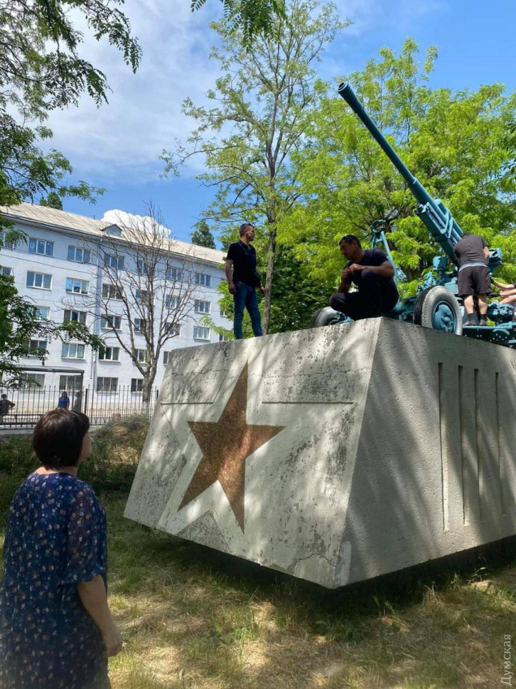 У школы №56 на Тенистой улице демонтируют установленное на постаменте советское зенитное орудие 52-К.