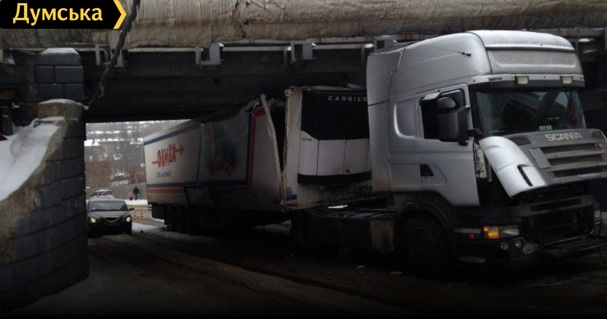 Вообще-то в нормальных странах перед такими мостами ставят ещё габаритный ограничитель из труб или чего там ещё, что б, если что, зацепился раньше чем за мост и без особого ущерба, но для нашего города это что-то из области фантастики, проще вытаскивать застрявшую фуру из под моста, причём не единственного в городе.