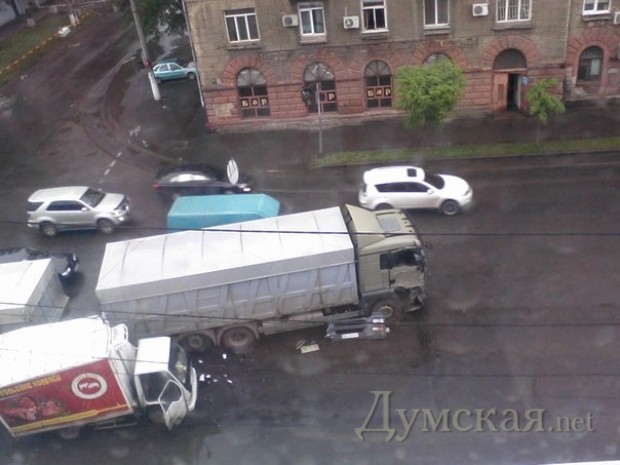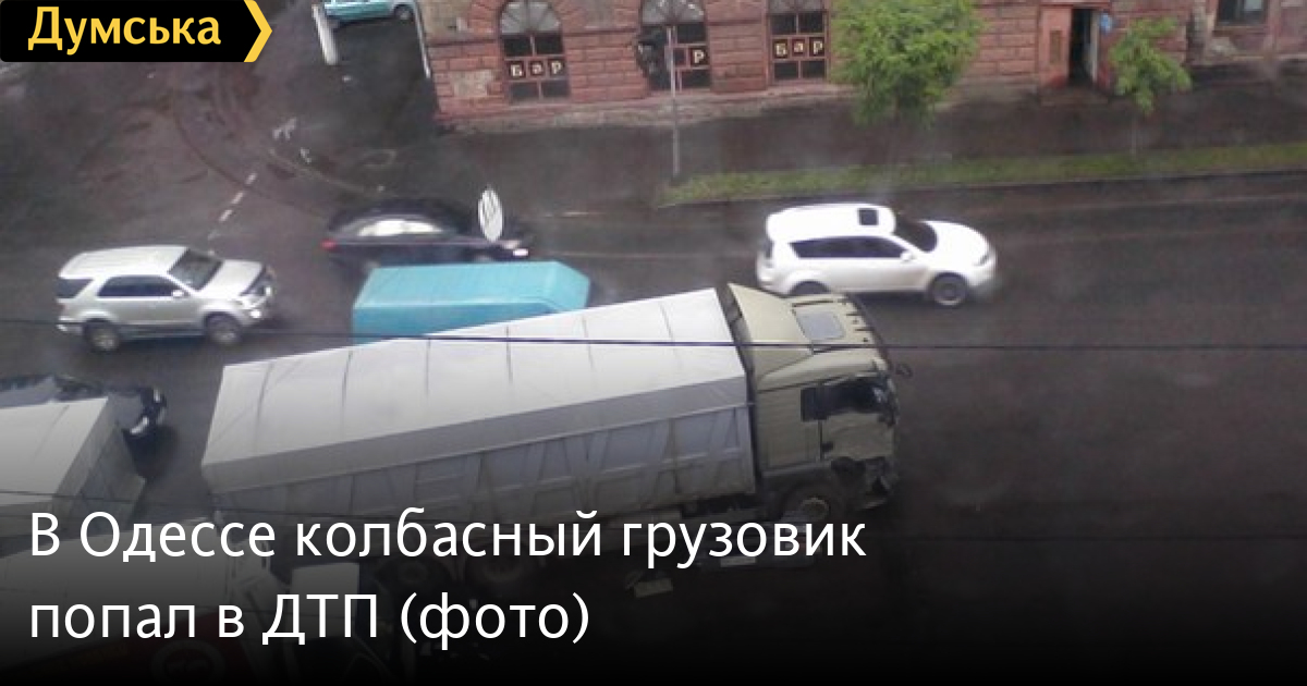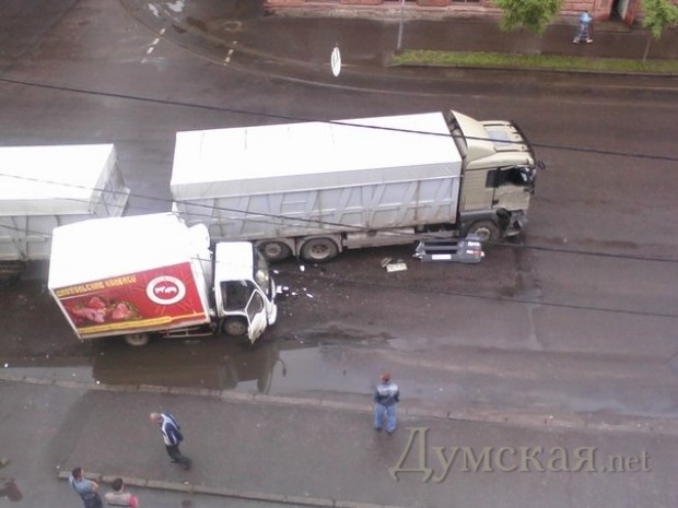 Как сообщают участники паблика «Одесса как она есть», на пересечении улиц Атамана Головатого и Церковной столкнулись фура и грузовик, перевозивший колбасные изделия.