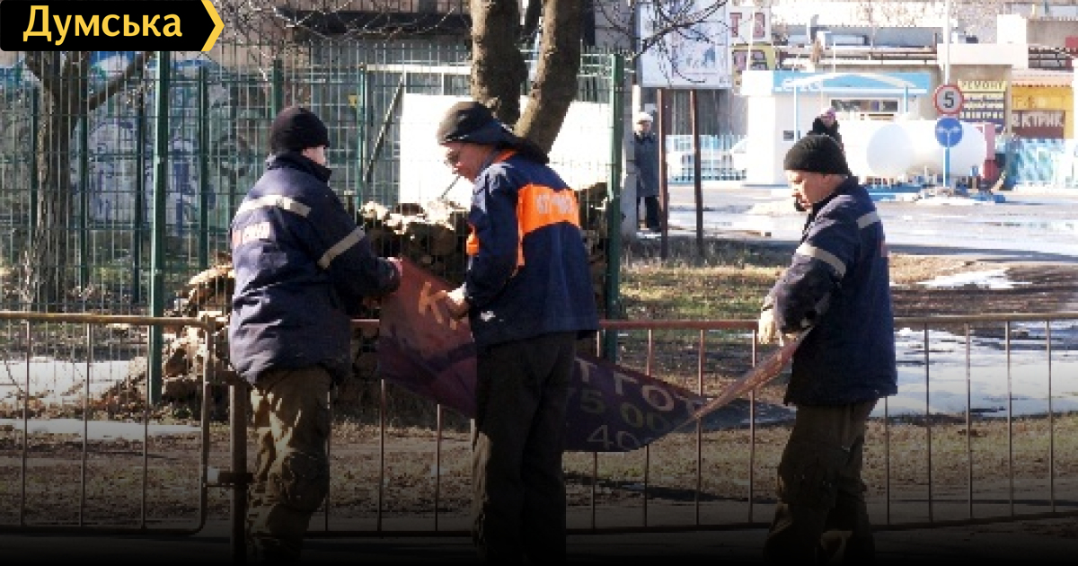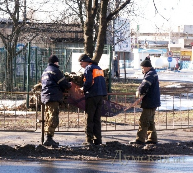 Работники КП «СМЭП» снимают рекламные баннеры, прикрепленные к пешеходным ограждениям на улицах Одессы.