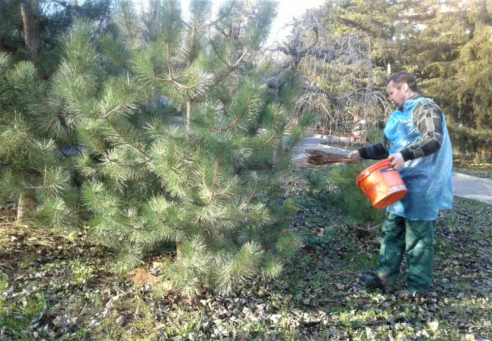 Озеленители одесского КП «Горзелентрест» приступили к работам по опрыскиванию хвойных насаждений специально разведенным раствором мела.