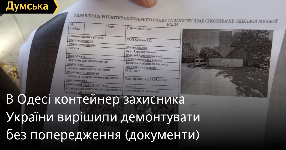 В Одесі контейнер захисника України вирішили демонтувати без попередження (документи)В Одесі намагаються демонтувати контейнер підприємця, який наразі захищає Україну на фронті. Чоловік каже, що демонтаж об'єкту проводять без попереджень та всупереч рішенню Кабінету Міністрів про зупинення термінів адміністративних послуг та видачу документів дозвільного характеру під час війни. Ігоря призвали до армії за мобілізацією. На цей час він заморозив в Одесі свій невеликий бізнес – в одній із промзон у нього функціонував продовольчий магазин. З лютого магазин стояв закритим, а чоловік справно платив за оренду твердого покриття, на якому він стоїть. Коли почали підходити терміни дії паспорта прив'язки та договору, дружина Ігоря вирушила до Департаменту надання адміністративних послуг на вулиці Косівській, проте всередину установи її не впустили. Зв'язатися зі спеціалістом їй вдалося лише за телефоном. Він запевнив її, що переживати не варто, і що під час війни бізнес її чоловіка ніхто не чіпатиме. Однак насправді все виявилося інакше. «Сьогодні дружині зателефонував сторож і сказав, що прийшли якісь люди, не представилися, наклеїли на контейнер папірці про демонтаж і почали самовільно зрізати стійки навісу та знімати дах. У результаті ми зазнали матеріальних збитків. Вже коли на місце приїхала дружина, вони їй сказали, що ці папірці вони наклеїли ще у серпні, хоча на них ще навіть клей не висох», — розповідає Ігор. Несподівані гості показали рішення Одеської міської ради про демонтаж тимчасової конструкції та запевнили, що незабаром повернуться та доведуть справу до кінця. У мерії кажуть, що їм ніхто не повідомив про те, що власник контейнера служить на фронті і фізично не може займатися продовженням дозвільної документації. «До нас ніхто не звернувся за продовженням, хоча зараз це може зробити будь-який член сім'ї, якщо людина в армії. Об'єкт не працював, його винесли на виконком», — повідомляють у мерії. Тим часом Ігор заручився підтримкою командування частини, в якій служить, і вже завтра вирушить у вимушений відгул, щоб врегулювати конфлікт, що виник. Помітили помилку? Виділяйте слова з помилкою та натискайте control-enter |