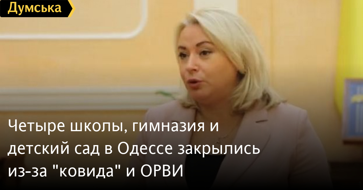 Четыре школы, гимназия и детский сад в Одессе закрылись из-за «ковида» и ОРВИИз-за массовой заболеваемости детей в Одессе закрыли четыре школы, гимназию и детский сад. По словам директора городского департамента образования и науки Елены Буйневич, речь идет не только о коронавирусе, но и о сезонном росте острых респираторных вирусных инфекций. «У нас сейчас идет точечное закрытие школ, 4% классов закрыто, это 152 класса. Полностью закрыты 5-11 классы в школах №23, 27, 113, 101 и гимназии №1, а также детский сад №115. Всего в садах закрыто 12 групп», — отметила она. По ее словам, ситуация с заболеваемостью в школах остается контролируемой. Елена Буйневич подчеркнула, что дети, которые сейчас не посещают школу, продолжают учиться в дистанционном режиме. СМЕРТЬ РОСІЙСЬКИМ ОКУПАНТАМ! Помітили помилку? Виділяйте слова з помилкою та натискайте control-enter