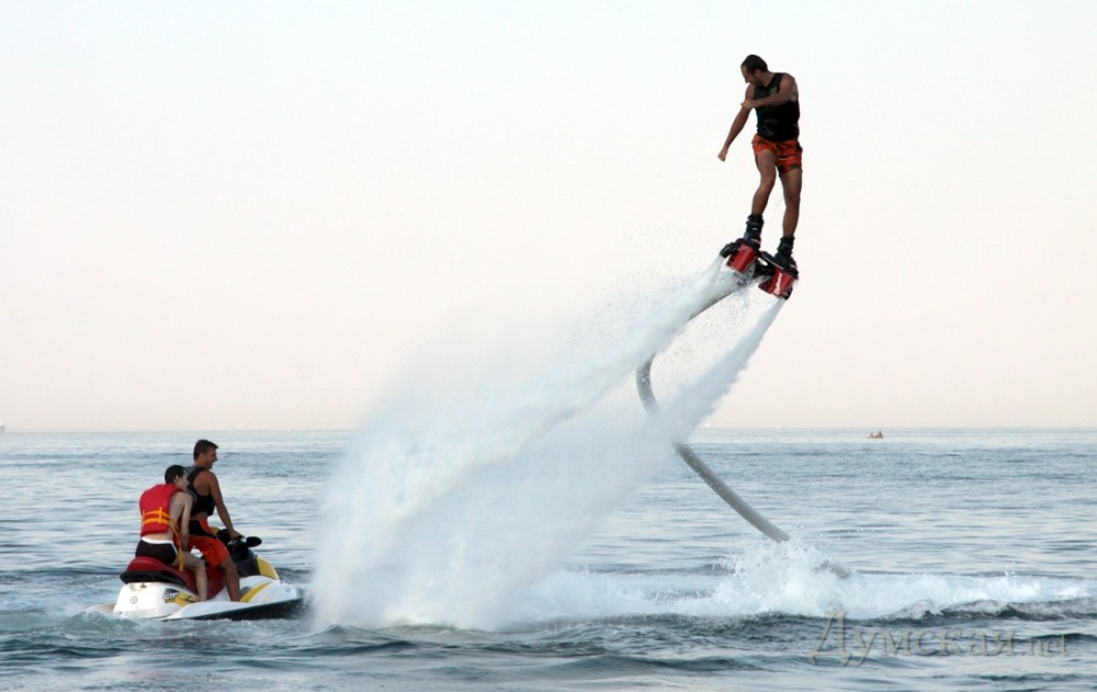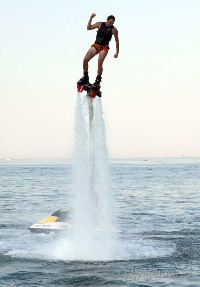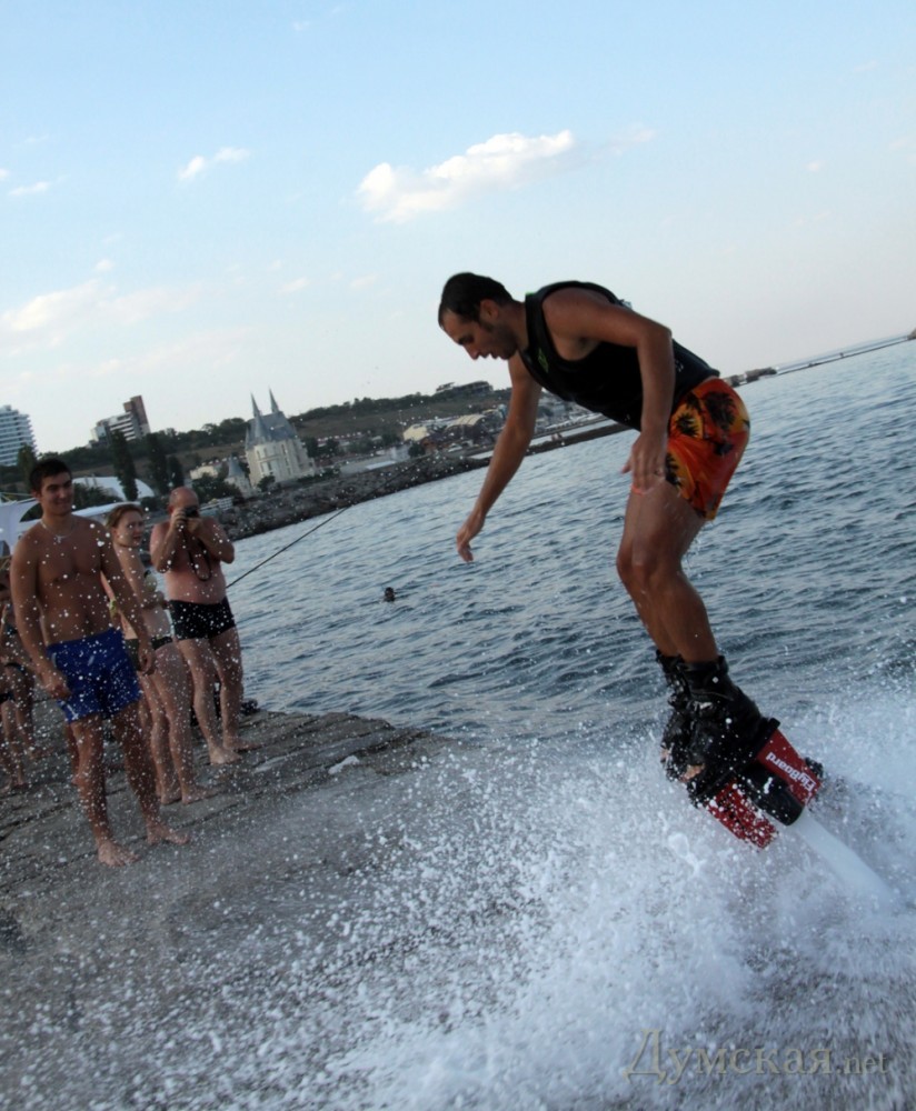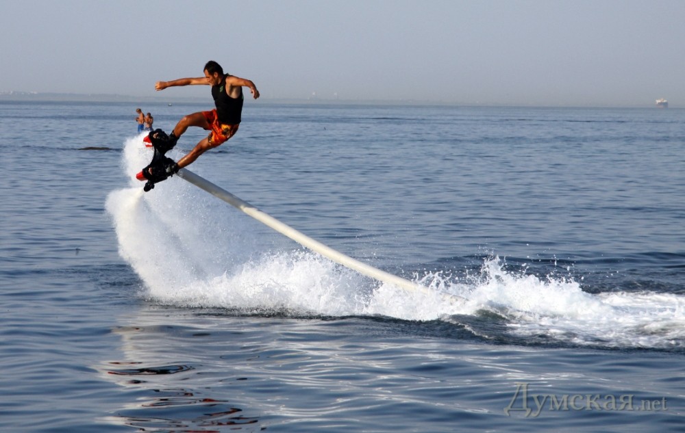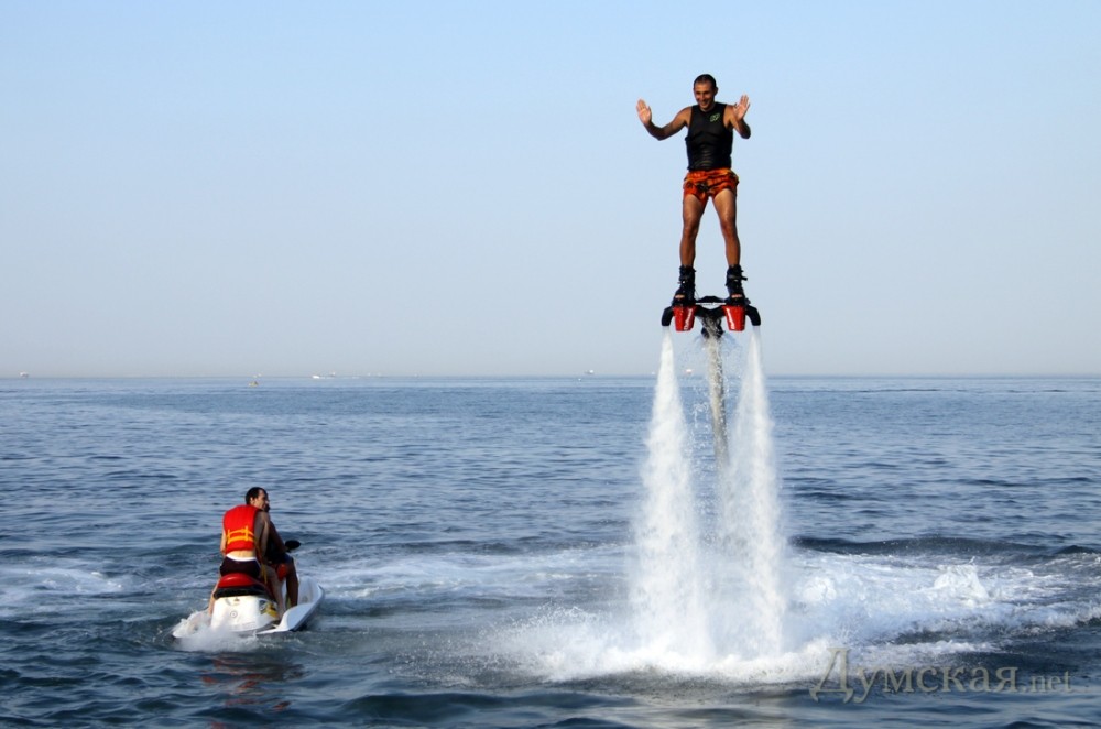 Необычный аттракцион появился в Одессе. На 10-ой станции Фонтана отдыхающим предлагают полетать над водой, стоя на специальной платформе — флайборде. Приноровившись, можно подняться на высоту до десяти метров. Само устройство было запатентовано всего два года назад и стремительно набирает популярность во всем мире. Идея изобретения принадлежит чемпиону Франции по водным лыжам Фрэнки Запата. Первые международные соревнования по флайборду прошли в прошлом году в Катаре. Этот механизм, как и все гениальное, устроен очень просто. К водомету обычного скутера подключается шланг, который заканчивается платформой. Струи воды извергаются из-под ног человека, и реактивная тяга позволяет ему подняться в воздух. Опробовать новинку удалось и корреспонденту «Думской». Итак, стартуем с пляжа и выходим в море за волнорез. Там ноги пристегивают к платформе, как на сноуборде. В первые минуты нужно привыкнуть к новым ощущениям и научиться держать равновесие. Этот процесс напоминает выступление циркача, балансирующего на нескольких металлических цилиндрах – здесь вы пытаетесь удержаться на струях воды, не давая флайборду сильно наклоняться в стороны. Как только вам удастся стать ровно, начнется набор высоты. Теперь главное — не отвлекаться на плавающих под водой медуз. Размышляя о том, что некоторые из них достигают в длину полуметра, можно легко потерять равновесие. Впрочем, болезненное падение экстремалам вряд ли грозит. Струи гасят скорость, что позволяет плавно войти в воду. Правда, стоит такое развлечение недешево. Чтобы испытать себя в роли Тони Старка, придется выложить аж 500 гривен. Автор фото — АВС СМЕРТЬ РОСІЙСЬКИМ ОКУПАНТАМ! Помітили помилку? Виділяйте слова з помилкою та натискайте control-enter |