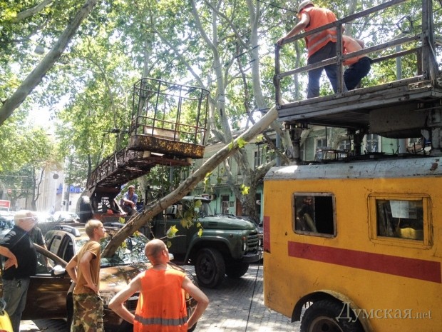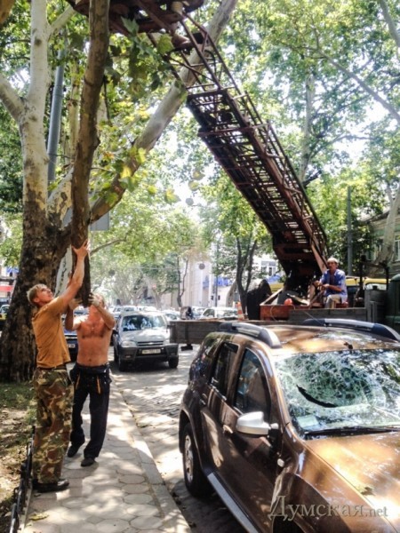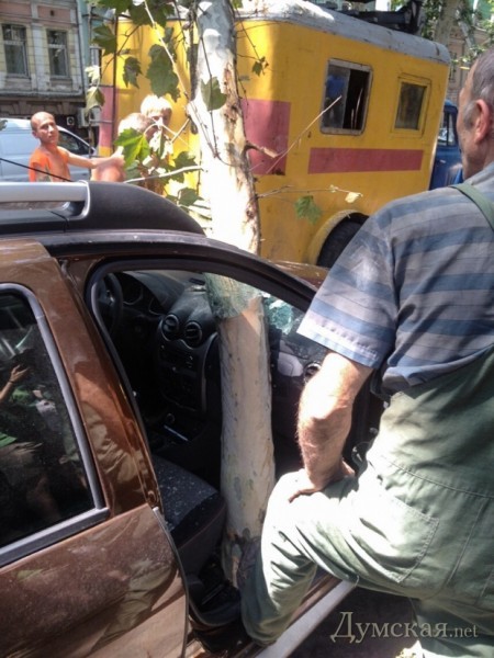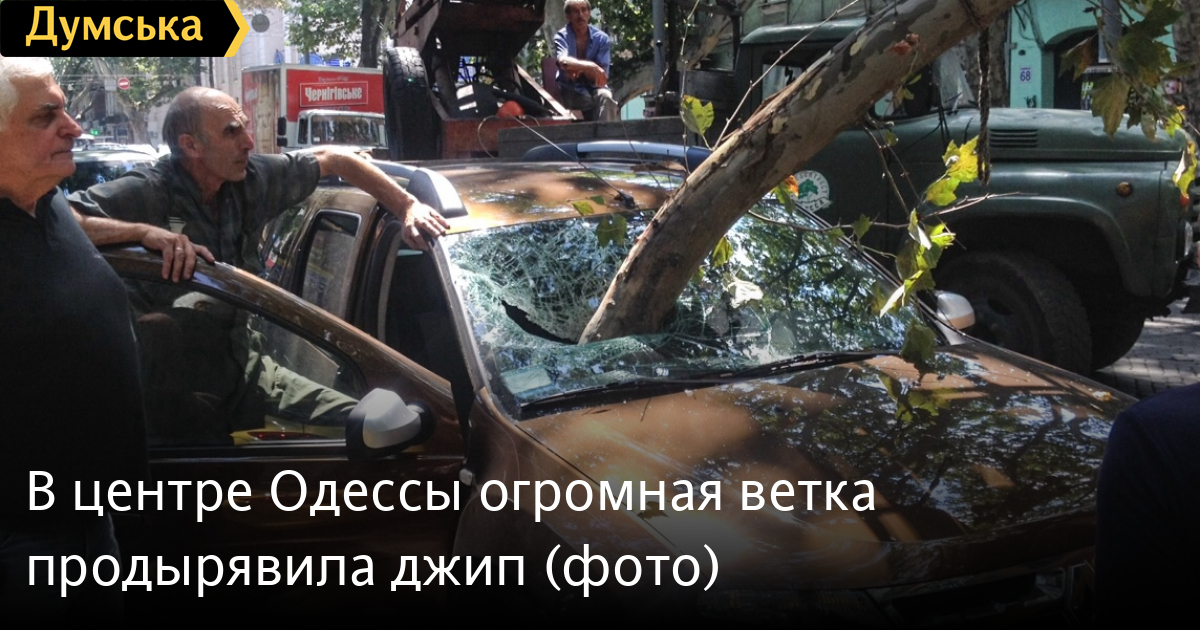На Пушкинской улице, между Большой и Малой Арнаутскими, огромная ветка платана насквозь пробила лобовое стекло внедорожника, припаркованного возле тротуара.
