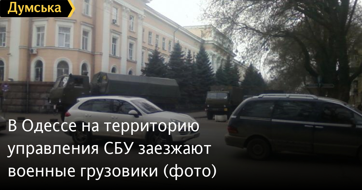 Четыре военных грузовика, предназначенных для перевозки людей, заехали на территорию управления Службы безопасности Украины в Одесской области, что на Екатерининской улице.