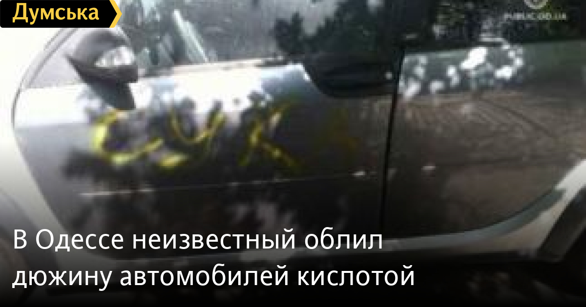 В ночь с 24-го на 25 июля в Одессе на автостоянке, что на углу проспекта Добровольского и улицы Махачкалинской, неизвестный мужчина облил какой-то кислотой 12 автомобилей. Об этом со ссылкой на руководителя пресс-службы горуправления внутренних дел Татьяну Хмельницкую пишут «Вести». «Ночью в Суворовский райотдел поступила информация о том, что какой-то человек ходит и чем-то поливает машины. После приезда оперативной группы выяснилось, что более автомобили облиты какой-то едкой жидкостью, с кузовов облезла краска. Вредителя задержать не удалось, он скрылся до приезда милиции. По факту открыто уголовное производство за умышленное повреждение чужого имущества», — пояснила правоохранитель. По словам Татьяны Хмельницкой, подобных случаев ранее не отмечалось. Интересно, что жильцы соседних с автостоянкой домов говорят о том, что автомобили могли испортить из чувства мести — рев моторов с автостоянки слышен за несколько сот метров от нее. По словам юриста Игоря Завальнюка, владельцам испорченных авто нужно подавать в суд на владельцев стоянки: «Стоянка юридически берет на себя ответственность за сохранность машин, необходимо составлять акт материального ущерба и выписку из журнала стоянки о том, что машина находилась на ее территории. Также нужно подключать страховую компанию — они должны брать на себя судебные издержки и возмещение ущерба». Интересно, что в тот же день появилось и другое сообщение — якобы в самом центре города, на ул. Ланжероновской, пожилая женщина поцарапала несколько припаркованных автомобилей. Однако по словам правоохранителей к ним жалоб по этому случаю не поступало. СМЕРТЬ РОССИЙСКИМ ОККУПАНТАМ! Заметили ошибку? Выделяйте слова с ошибкой и нажимайте control-enter |