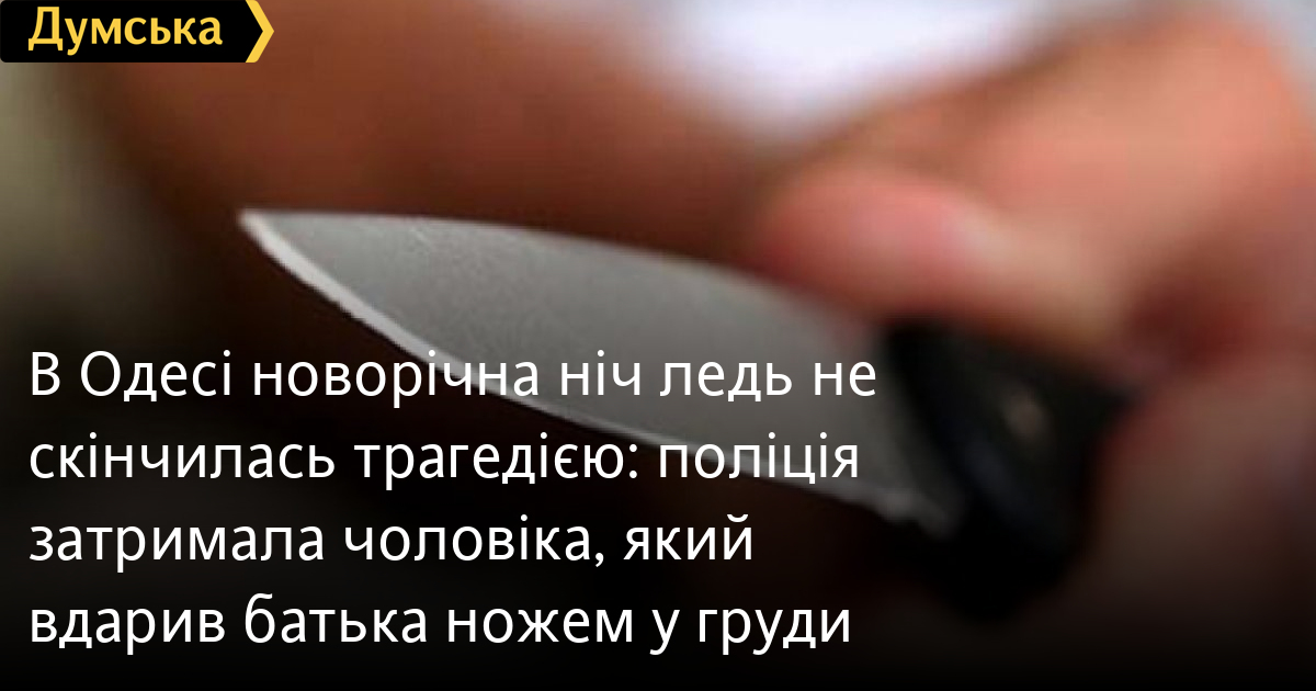 В Одесі новорічна ніч ледь не скінчилась трагедією: поліція затримала чоловіка, який вдарив батька ножем у груди24-річного мешканця Одеси, який у новорічну ніч вдарив свого батька ножем у груди, затримали правоохоронці. Як повідомили у пресслужбі поліції регіону, подія сталася у помешканні родини. Як розповів правопорушник, конфлікт між чоловіками стався під час розпивання алкоголю. Син ударив батька, бо той за святковим столом не хотів слухати з ним музику, натомість віддав перевагу перегляду телепередач. За це затриманий двічі вдарив 61-річного родича ножем у груди, після чого викликав швидку. Під час огляду місця злочину поліцейські вилучили ніж та інші речові докази. Фігуранту повідомили про підозру в закінченому замаху на умисне вбивство. Цей злочин передбачений ч. 2 ст. 15 ч. 1 ст. 115 Кримінального кодексу України і карається позбавленням волі на строк від семи до 15 років. Підозрюваного помістили до ізолятора тимчасового тримання й зараз клопочуть щодо застосування відносно нього запобіжного заходу у вигляді тримання під вартою. Помітили помилку? Виділяйте слова з помилкою та натискайте control-enter Новини по цій темі: 29 липня 2025: В Усатово Одеської області сталася перестрілка: поліція працює на місці (відео, оновлено) 28 липня 2025: П'яний на "Ягуарі" або гіпертонік? Звільнений топ-посадовець одеської поліції хоче повернутися на службу 19 червня 2025: Дівчинку, яку шукали сотні одеситів, знайшли вбитою: поліція працює з чоловіком, ймовірно причетним до загибелі 27 травня 2025: Увели гектар в університету: на Одещині засудили земельних аферистів, але без посадки і Хвоста |